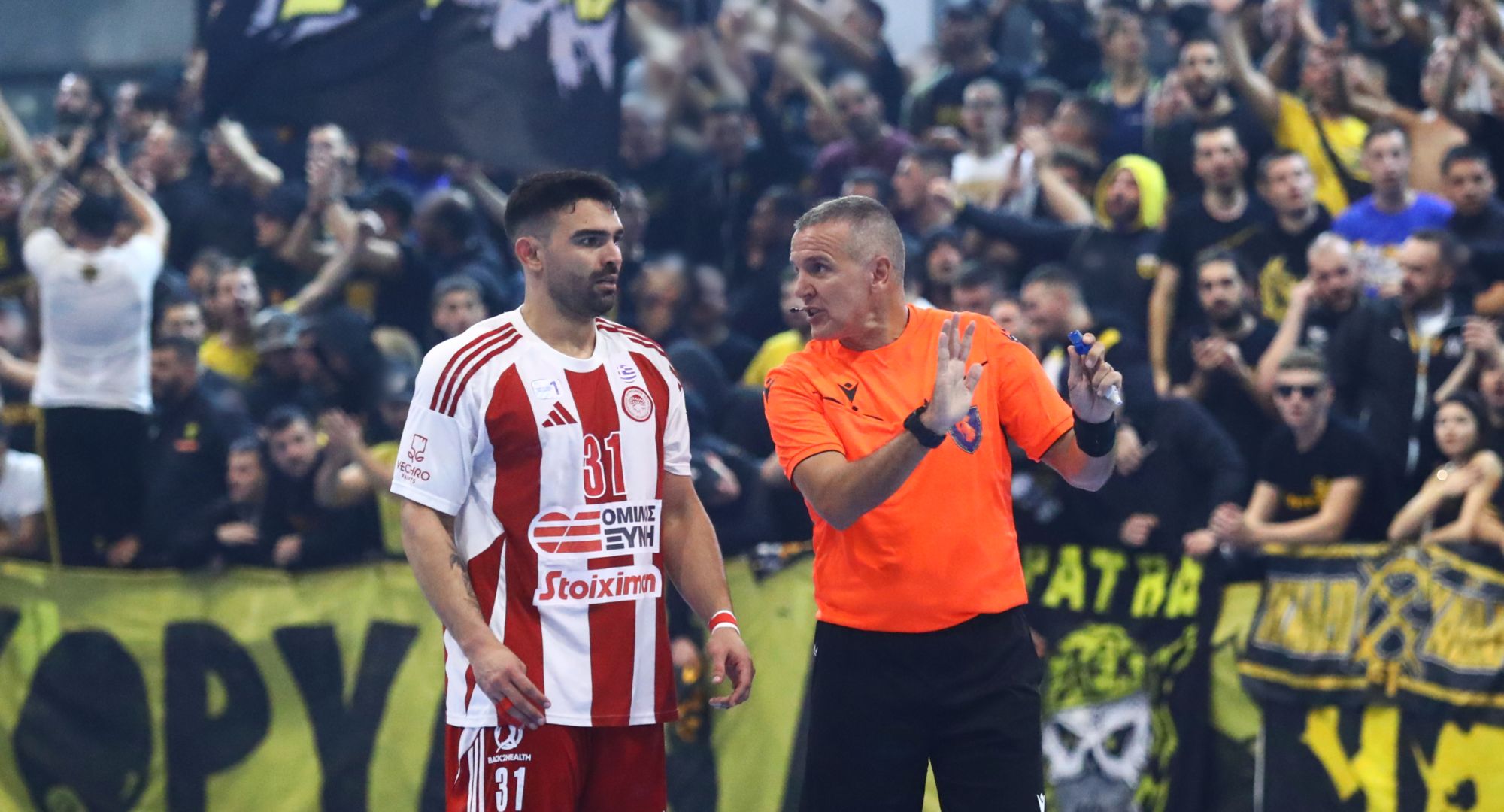Η ομάδα χάντμπολ Ανδρών του Ολυμπιακού/Ομίλου Ξυνή ηττήθηκε με 28-27 από την ΑΕΚ στην αίθουσα «Γ. Κασιμάτης» του ΟΑΚΑ, για την 8η αγωνιστική της Handball Premier. Στην έδρα των «κιτρινόμαυρων», όπου έχουμε γίνει πολλές φορές μάρτυρες εικόνων που προσβάλουν το άθλημα, καταστρατηγήθηκε κάθε έννοια των κανονισμών. Ακούστηκαν συνεχόμενα υβριστικά συνθήματα κατά του Σάββα Σάββα (και όχι μόνο) και αντί να εκκενωθεί το γήπεδο, όπως προβλέπει ο κανονισμός, το ματς συνεχίστηκε κανονικά, μετά από διακοπή πάνω από 20 λεπτών.